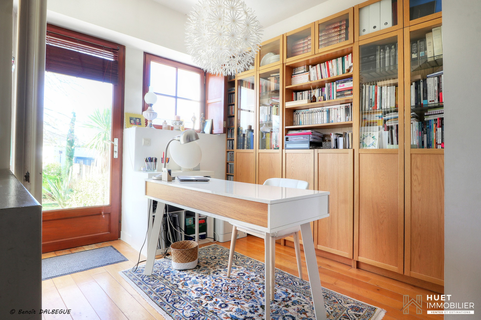 Dans la partie la plus ancienne orné d'un joli parquet, un couloir dessert deux chambres avec grands placards, une jolie salle d'eau et un bureau ouvert avec une grande bibliothèque. Une pièce actuellement aménagée en salon cosy laisse entrevoir le séjour par une fenêtre intérieure ; elle pourra convenir pour une autre chambre ou une chambre d'amis.