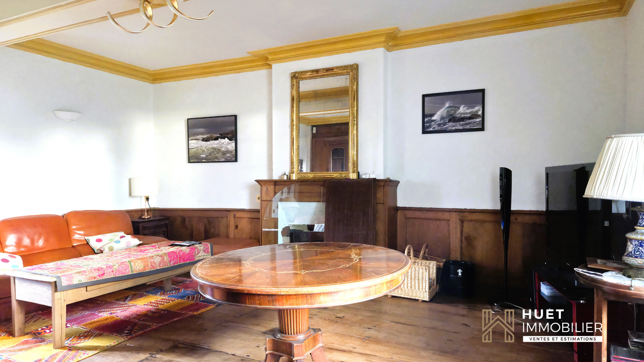 Un grand séjour avec parquet en chêne massif et cheminée, créant une atmosphère chaleureuse et intemporelle.